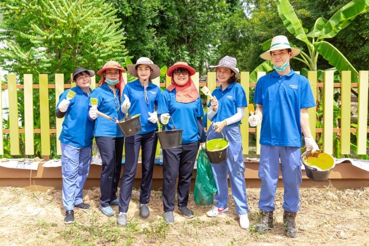 The activity started in the morning, President gave the donation equipment which the community lacked of and needed consisted of brooms, rakes and knife to Mr. Nonthakorn Sookprasert, Head of Moo. 5 and the representative of the community. After that, volunteers moved into 5 groups to implement new painting alternately green and orange to the wood fence made it even more bright and colorful. All volunteers have highly contribute themselves for the society until it finished with smile and happiness, although the sun worked so strongly spreading hot sunlight.