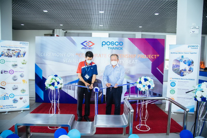 Mr. Youngchul Kwon, President of POSCO-Thainox Public Company Limited, and his staff delivered stainless steel benches with the universal design concept: awarded winner of POSCO-Thainox Design Award 2020 to the MRT Chalong Ratchadham (purple line) on November 16, 2021, totaling 16 stations, 32 sets and Phra Nang Klao Bridge pier, totaling 6 sets. Mr. Vithaya Punmongkol, Deputy Governor, officiated over the delivery on behalf of the Mass Rapid Transit Authority. The project has been carried out in accordance with the Corporate Citizenship philosophy of working together with the community and society to build a better future and achieve stainable success.