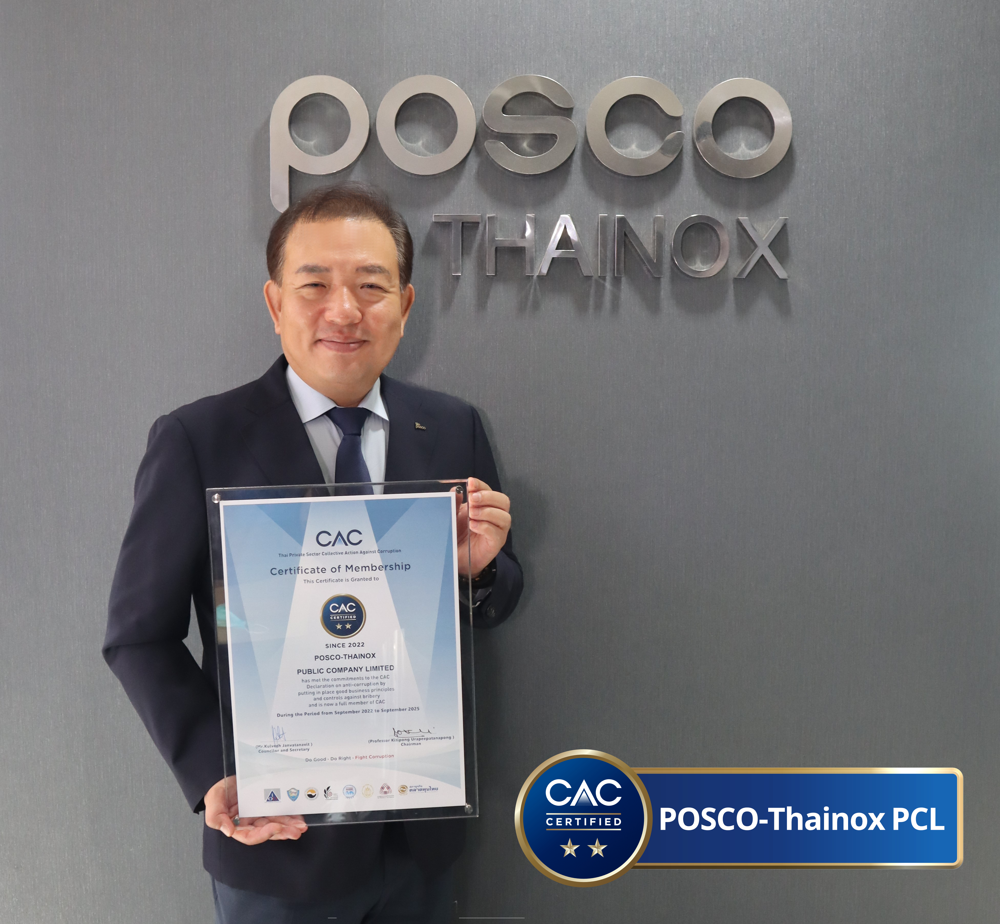 POSCO-ThainoxPublic Company Limited prepared and submitted a self-assessment in order to develop anti-corruption measures. The coalition committee passed a resolution in the second quarter of its 2022 meeting certifying the company as a member of the Thai Private Sector Collective Action Against Corruption (CAC). On this occasion, on 5 October 2022, Mr. Youngchul Kwon President, as a company representative, received the certificate which will be valid for 3 years.