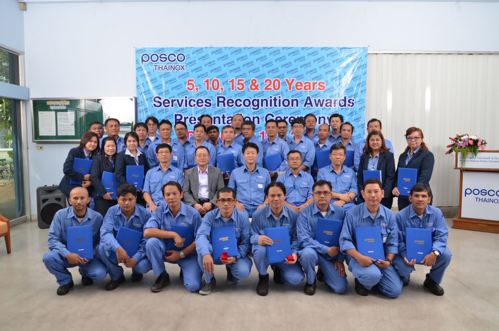 Management of POSCO-Thainox awarded the service year recognition rewards to employees who have contributed to the organisation and their tenures for 5, 10, 15 and 20 years service respectively. The awarding ceremony took place at the Rayong Plant, on December 19th, 2014. President and management from various divisions attended, total 67 employees awarded and categorized as 5 persons for 5 years service, 5 persons for 10 years service, 15 persons for 15 years service, and 42 persons for 20 years service.
