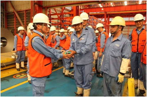 หลังจากนั้น คณะผู้บริหารได้เดินเข้าโรงงานระยองเพื่อกระตุ้นและส่งเสริมให้เกิดการตระหนัก ระมัดระวังเรื่องความปลอดภัยในการทำงาน โดยเฉพาะกับพนักงานที่ทำงานกับเครื่องจักร ทั้งนี้ท่านประธานได้ร่วมเดินและแจกเครื่องดื่ม และขนมให้กับพนักงานในส่วนการผลิตอีกด้วย