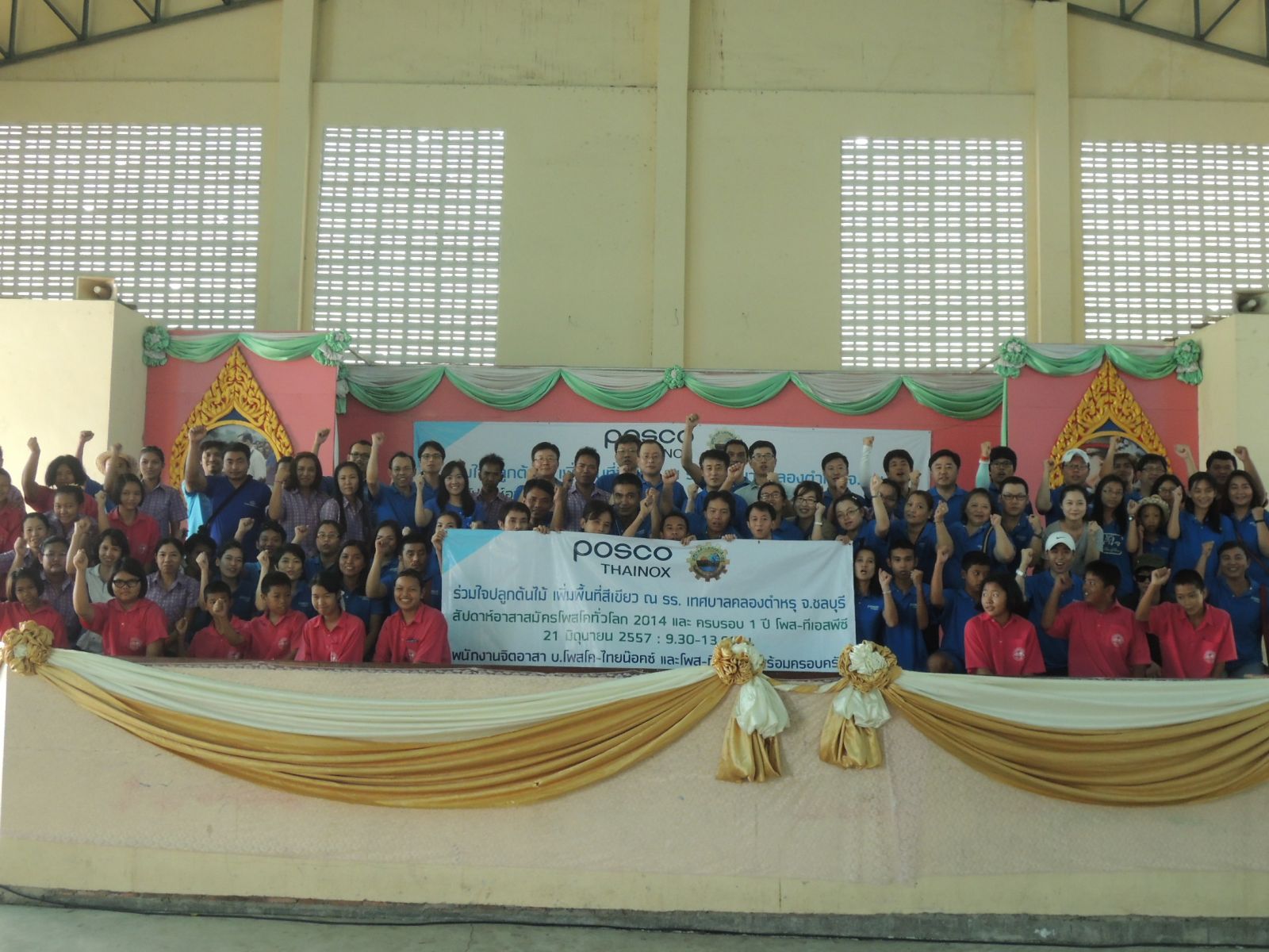 บริษัทโพสโค-ไทยน๊อคซ์ จำกัด (มหาชน) จัดกิจกรรมปลูกต้นไม้สร้างโลกสีเขียว เพื่ออาสาพัฒนาชุมชนเนื่องในวันจิตอาสาครอบครัวโพสโคทั่วโลกประจำปี 2557 และในโอกาสครบรอบ 1 ปีของการจัดตั้งศูนย์บริการโพส-ทีเอสพีซี ณ นิคมอุตสาหกรรมอมตะนคร จ.ชลบุรี ในการให้บริการตัดซอยแผ่นสเตนเลสตามความต้องการของลูกค้าและอุตสาหกรรมการผลิตต่างๆ โดยมีผู้บริหารและพนักงานจากสำนักงานใหญ่ในกรุงเทพ โรงงานผลิตที่จ.ระยอง และศูนย์บริการโพส-ทีเอสพีซี ใน จ.ชลบุรี รวม 74 คน ได้ร่วมกันปลูกต้นจามจุรี สลับกับต้นและต้นหางนกยูง ขนาดสูงต้นละ 3 เมตร จำนวน 21 ต้น ตลอดระยะรั้วของ สนามโรงเรียนเทศบาลคลองตำหรุ ซึ่งอยู่ใกล้เคียงกับศูนย์บริการโพส-ทีเอสพีซี